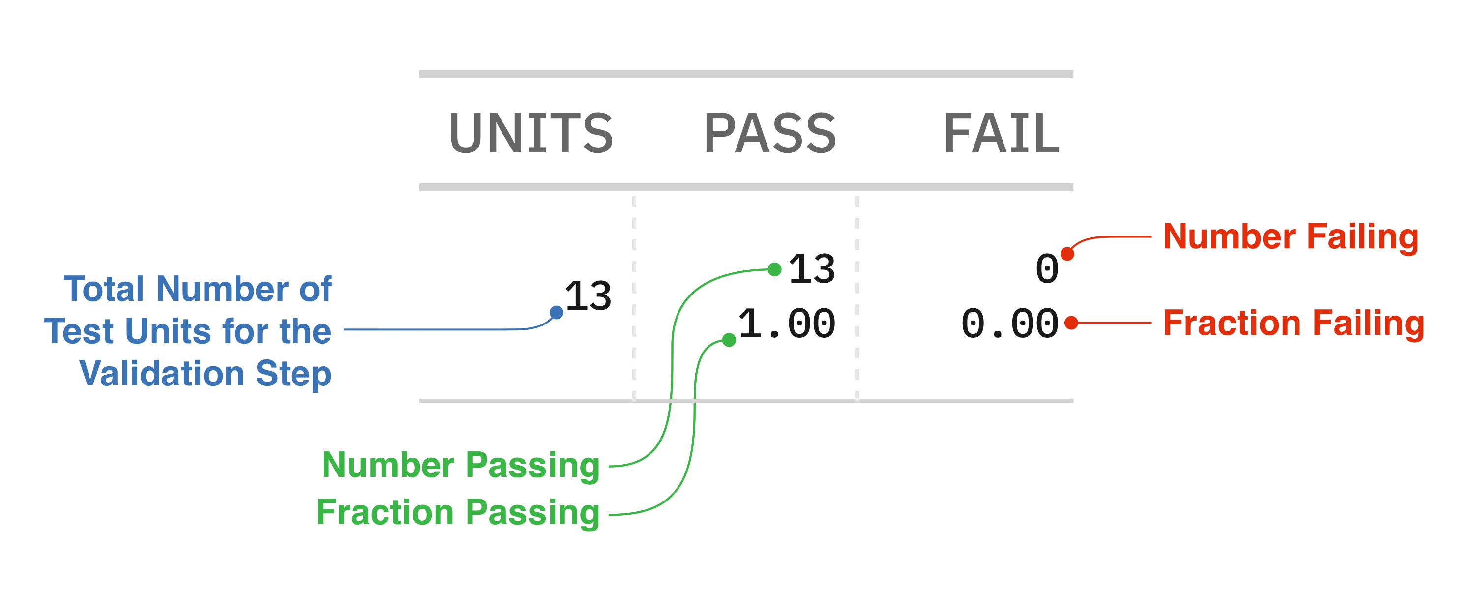 In the validation report table, test unit metrics are displayed under the UNITS, PASS, and FAIL columns. This diagram explains what the tabulated values signify: